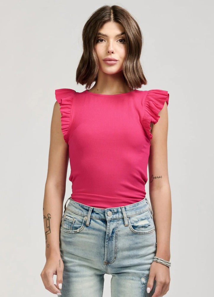 Brighten up your wardrobe with this vibrant pink ribbed top, featuring charming flutter sleeves and a flattering fitted shape—perfect for pairing with your favorite denim for an effortlessly chic look.