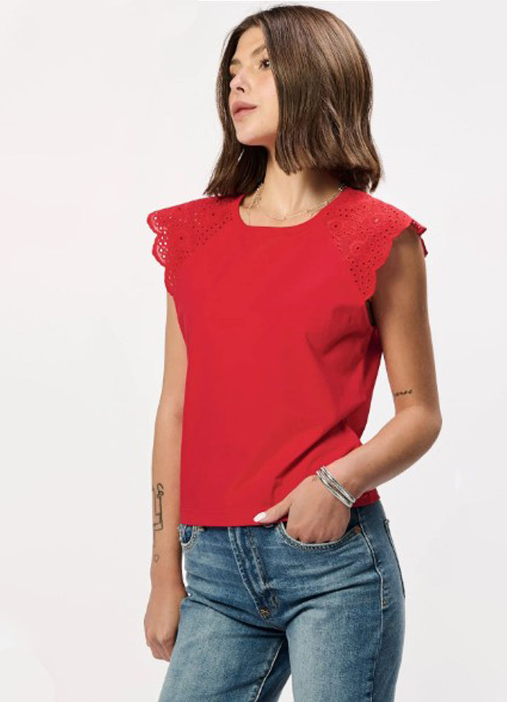This vibrant red sleeveless top brings a feminine touch with eyelet flutter sleeves and a clean, tailored fit — perfect for dressing up denim or pairing with summer skirts.