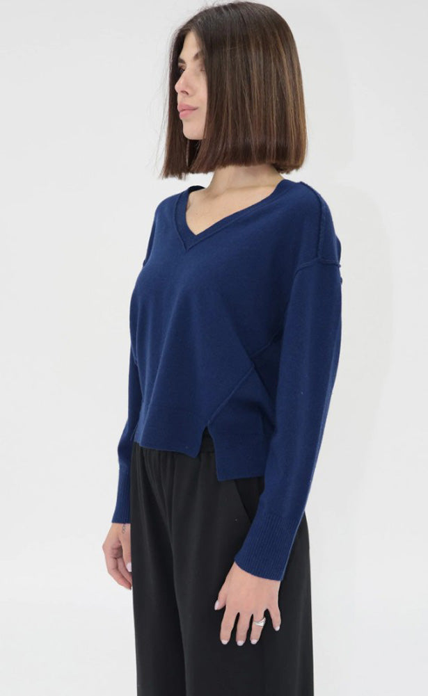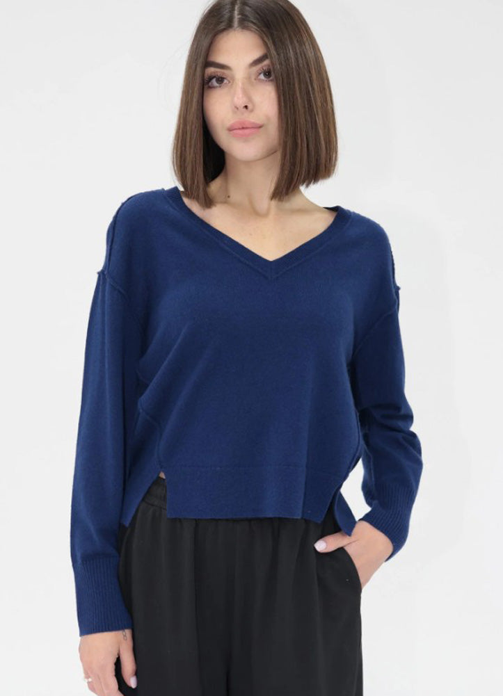 Cozy meets effortlessly chic in this relaxed V-neck knit sweater. Crafted in a rich midnight blue, this piece brings a refined pop of color to your wardrobe while offering all-day comfort. The soft knit fabric drapes beautifully, creating a flattering, easygoing silhouette that feels as good as it looks.