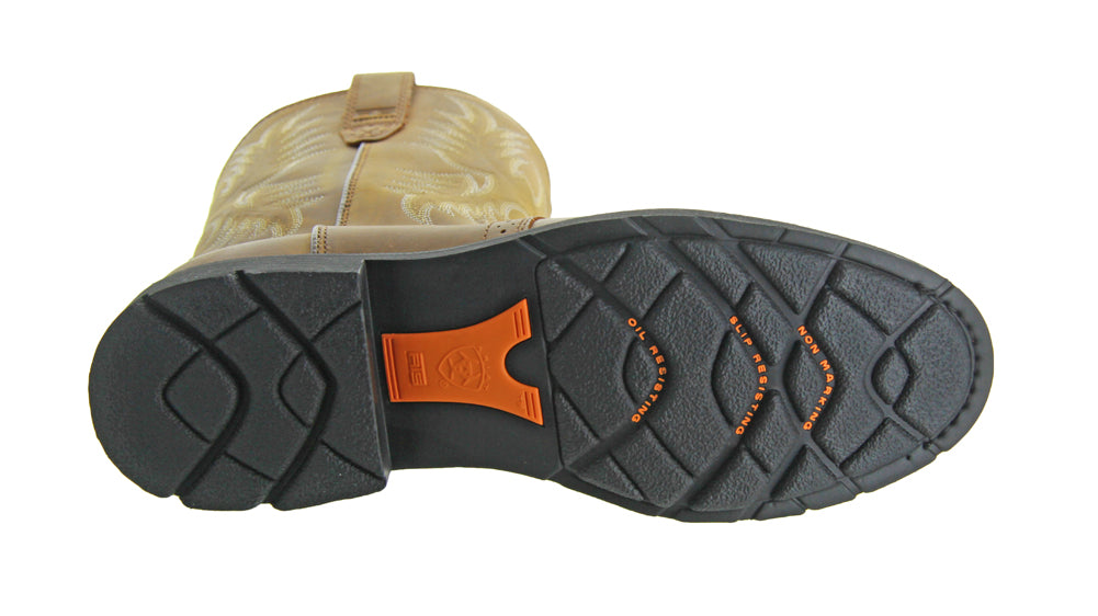 These Sierra Saddle Agedbark by Ariat work boots feature Ariat's ATS stability system, oil and slip resistant outsole, extreme heat and abrasion resistance, premium leather upper, and ergonomic support