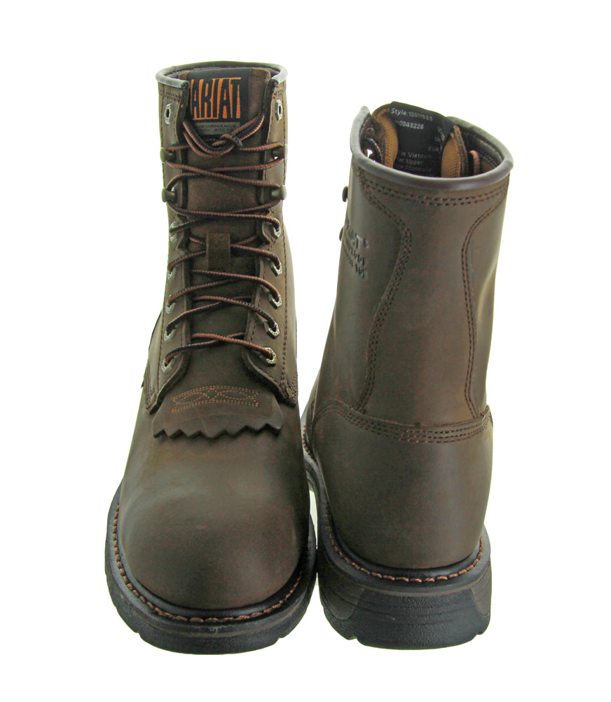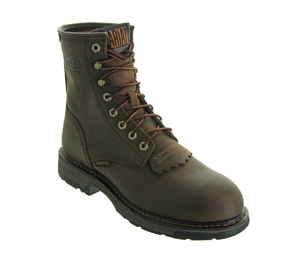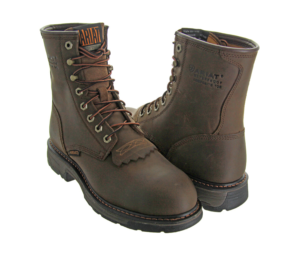 These Workhog 8" Oilly Distress Brn CT WP by Ariat work boots feature Waterproof Pro technology which shuts out rain, snow, and mud, Ariat ATS platform which provides foot support, a cushioning EVA midsole, and also has an oil and slip resistant outsole.