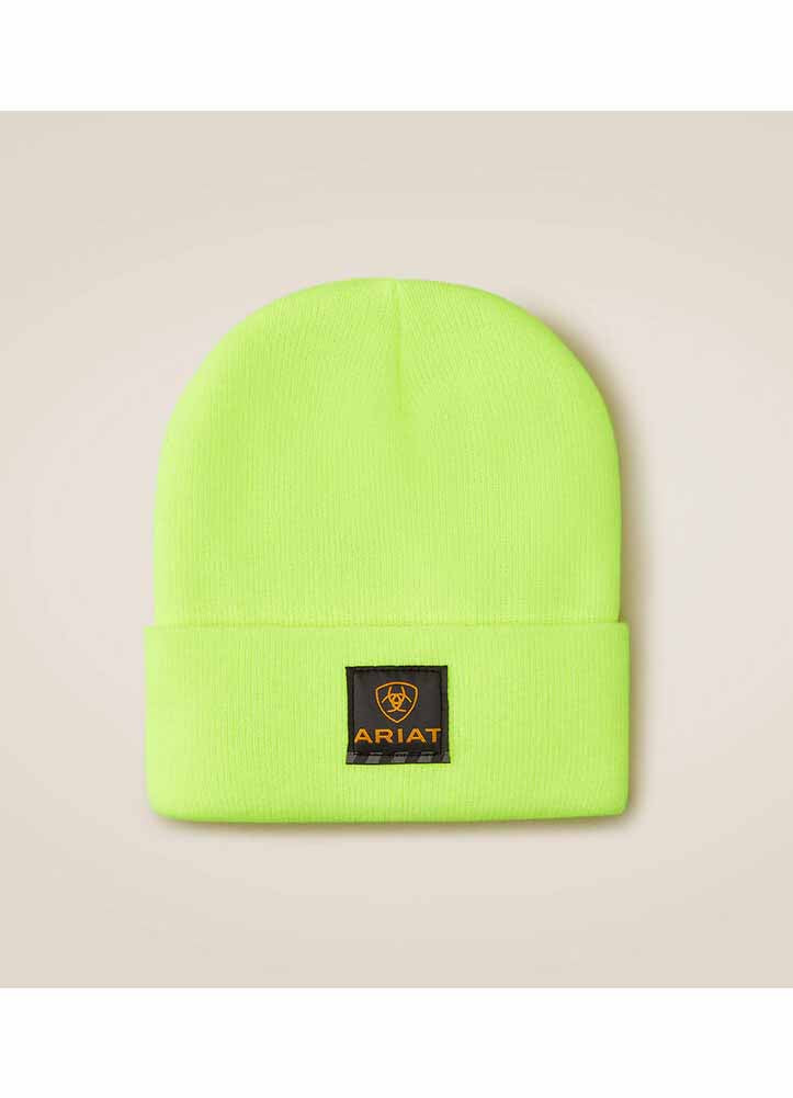 Keep your head warm in this rebar cap by Ariat. Knitted in a bright neon yellow material with accents of black and orange on the small logo in the front. This hat fold for adjustable comfort.