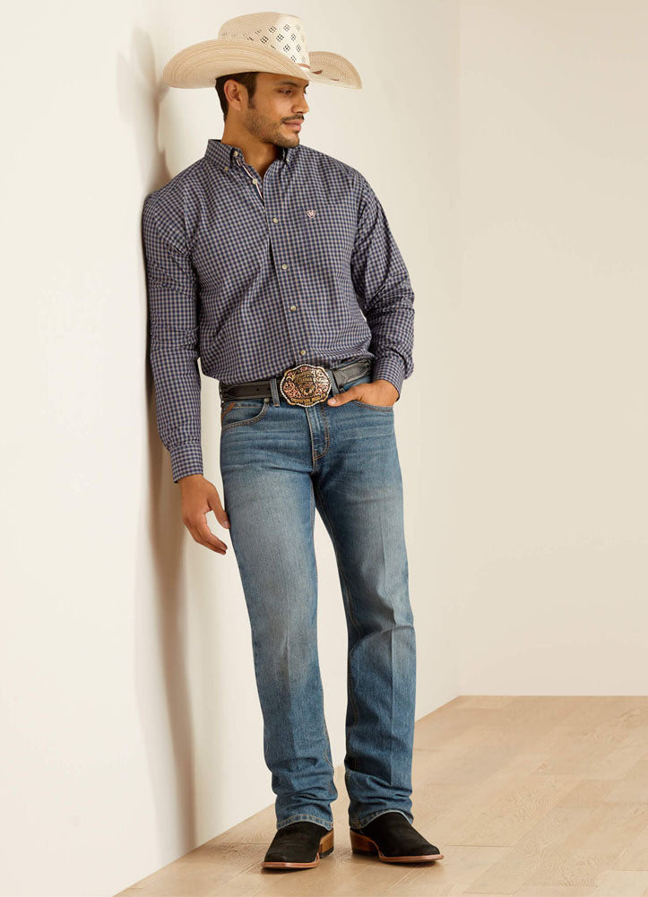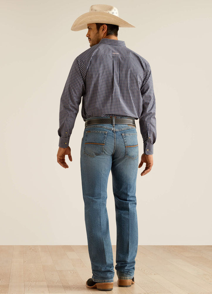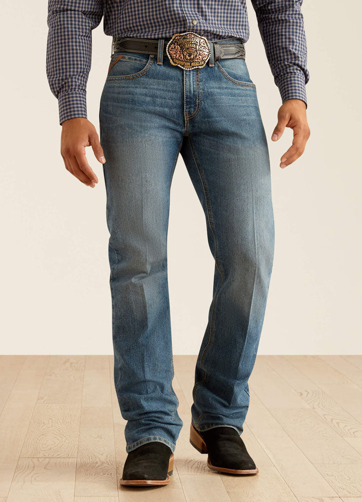 Style your favorite boots with Ariat's pro series jeans. Straight leg designed for a more slimming effect. Features light brown stitching on the front and back pockets. Comes with belt loops for an adjustable wear.