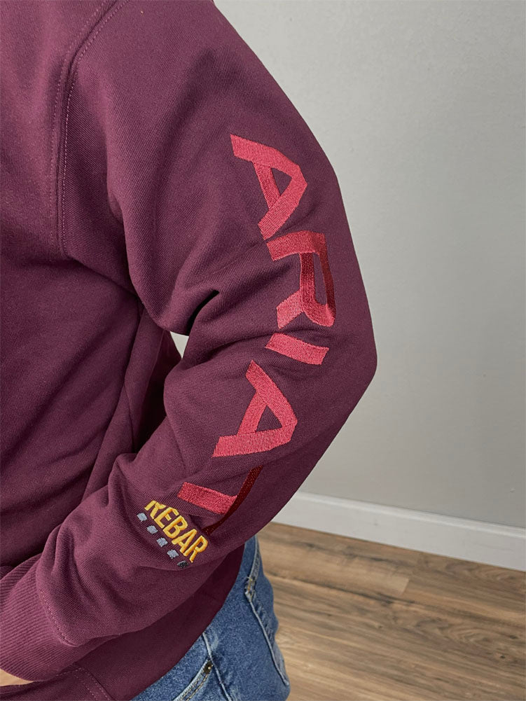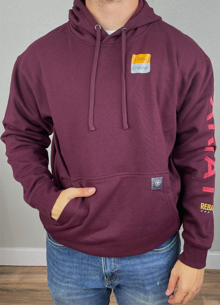 This Ariat Rebar hoodie delivers dependable warmth and durability with its deep burgundy color, water-repellent finish, and bold sleeve branding perfect for work, weekends, and staying comfortable in any weather.