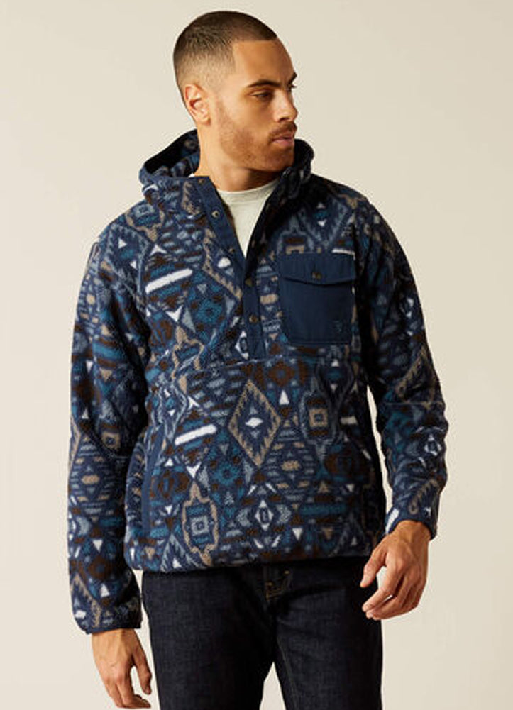 Ariat brings us this Polar bear fleece hoodie sure to keep you warm all Winter. Featuring a southwest print throughout this navy fleece hoodie. A blue snap chest pocket and snap front closure gives contrast. It has front side pockets as well.