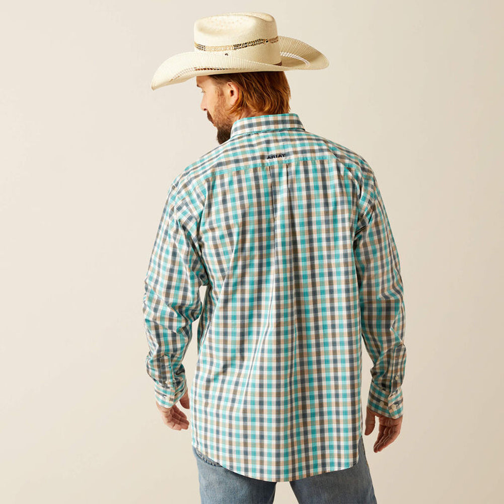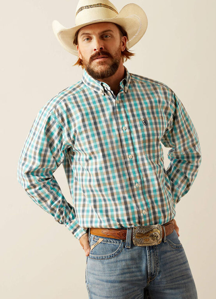 From ranch to rodeo, this classic button-down delivers sharp Western style with its crisp teal and tan plaid, durable construction, and embroidered chest logo — perfect for work or weekend wear.