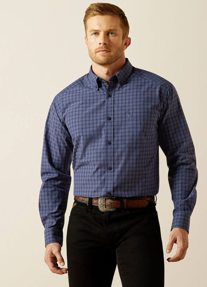 This navy check western shirt pairs timeless style with rugged durability, featuring a button-down collar, embroidered chest logo, and a comfortable fit designed for long days on the ranch or casual nights out.