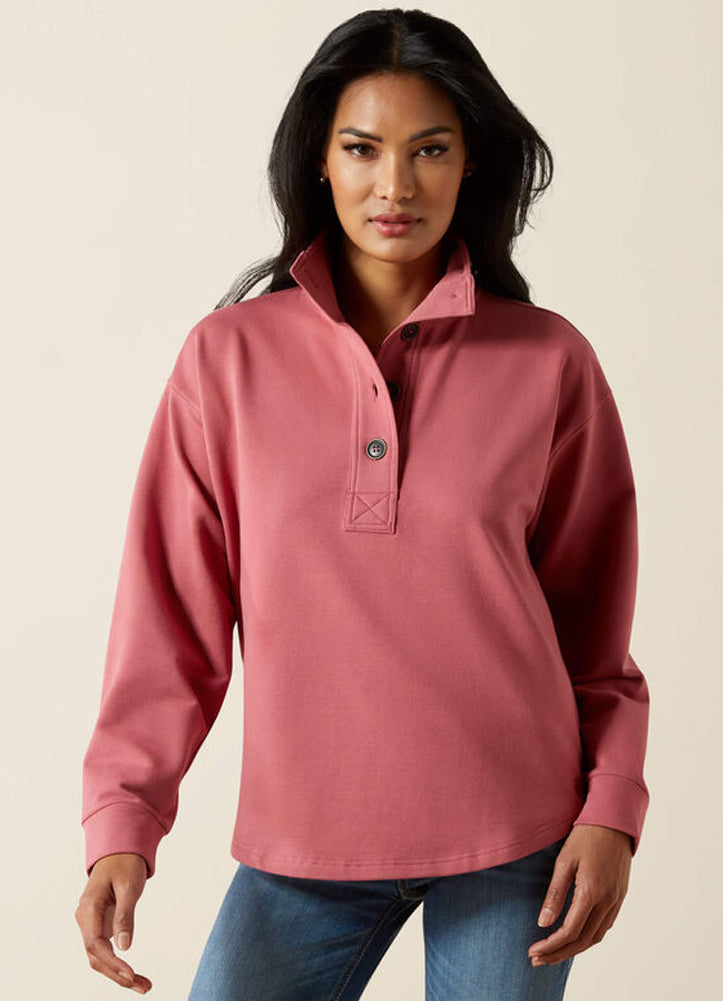 Ariat makes quality clothing that moves and works with you. This hometown sweatshirt is the prettiest color called mauvewood. Featuring 1/4 button front.