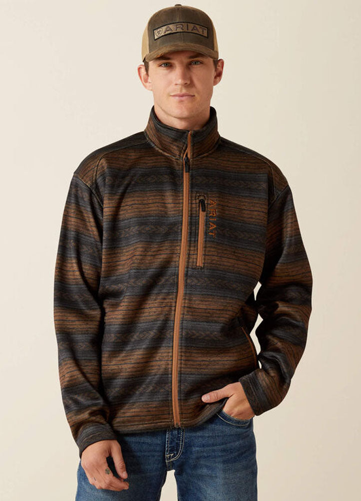 This Ariat full-zip jacket features a rugged brown and black striped design, a high collar, and zip pockets—combining warmth, durability, and western style.