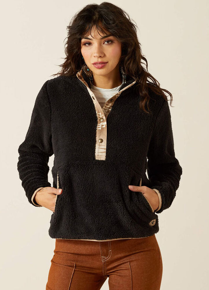 This cozy black sherpa pullover features a soft fleece texture, contrast beige button-up neckline, and front pocket. Perfect for casual, comfy, and stylish layering.