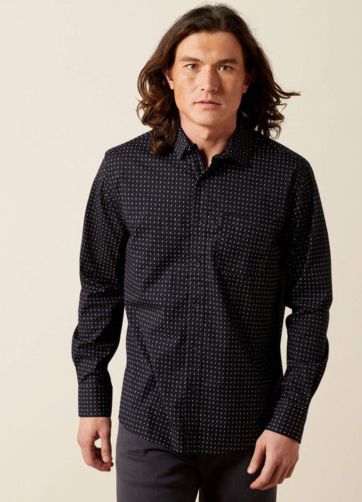 This sleek button-down shirt features a refined micro-dot pattern on a deep black base, offering a modern, polished look that transitions effortlessly from office wear to evening outings