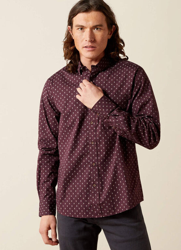 This rich burgundy button-down shirt features an elegant repeating teardrop print and a tailored fit, offering a refined yet modern look that's perfect for both work and evening occasions.