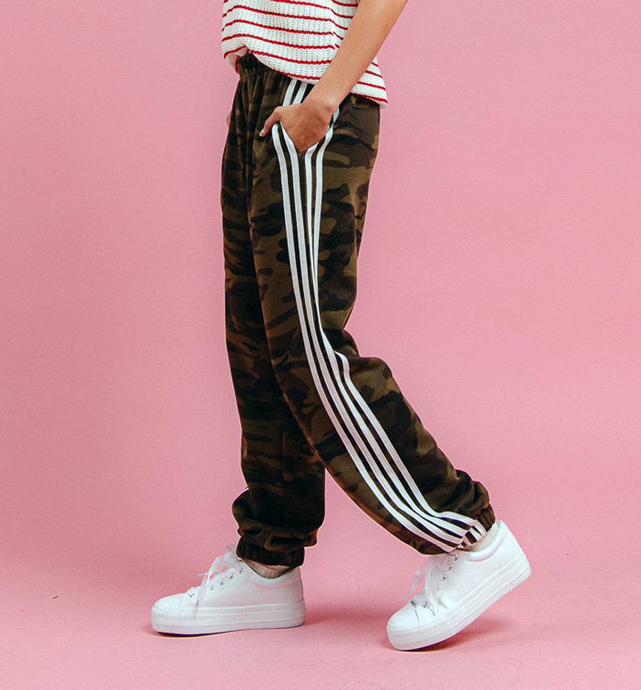 These trendy camouflage jogger pants feature a relaxed fit with elastic cuffs, sporty side stripes, and a soft, comfortable fabric blend — perfect for casual outings or lounging in effortless style.