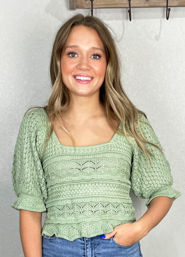 Puff Sleeve Cropped Crochet Top in Sage by BiBi
