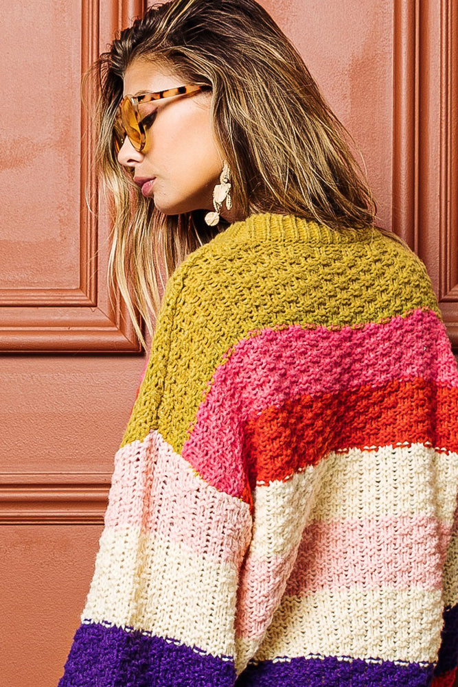 This bold and colorful striped sweater features a chunky knit texture with oversized sleeves and a relaxed fit, bringing cozy comfort and vibrant style to any casual or trendy outfit.