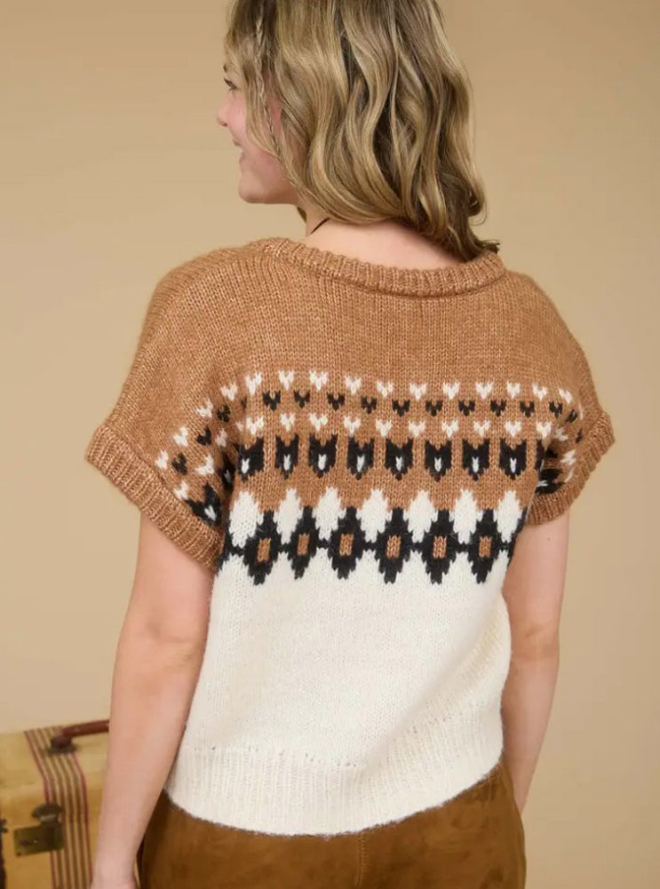 Stay cozy and stylish in this short sleeve knit sweater featuring a warm brown and ivory Fair Isle pattern, soft texture, and relaxed fit for this fall and winter.