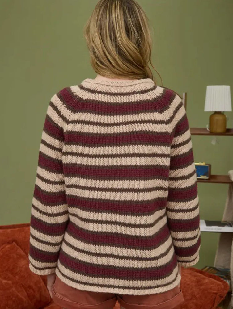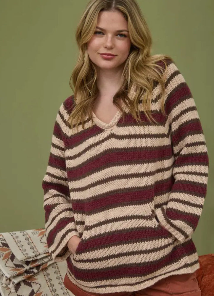 Multicolor Stripe Kangaroo Pocket Sweater in Burgundy Multi by Blu Pepper