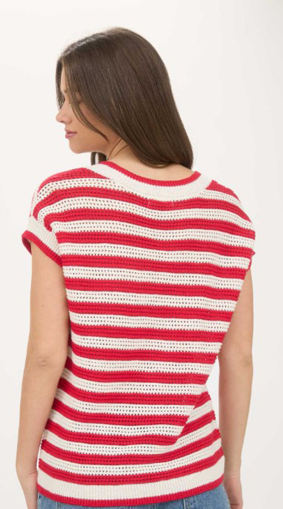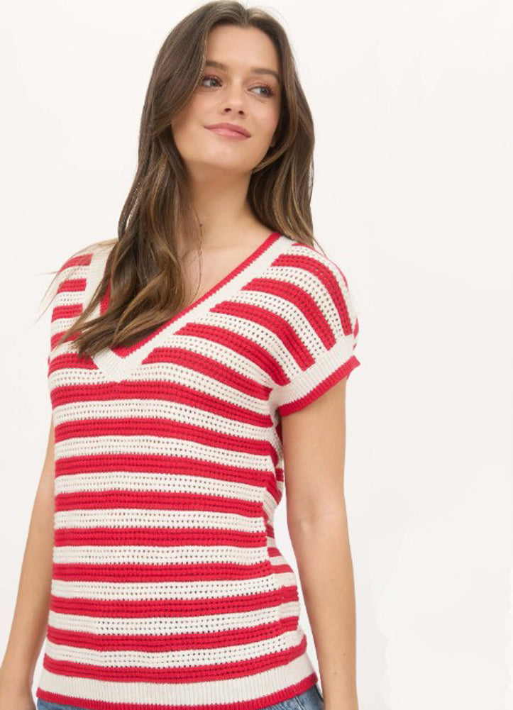 Stripe V Neck Crochet SS Sweater in Red by Blu Pepper