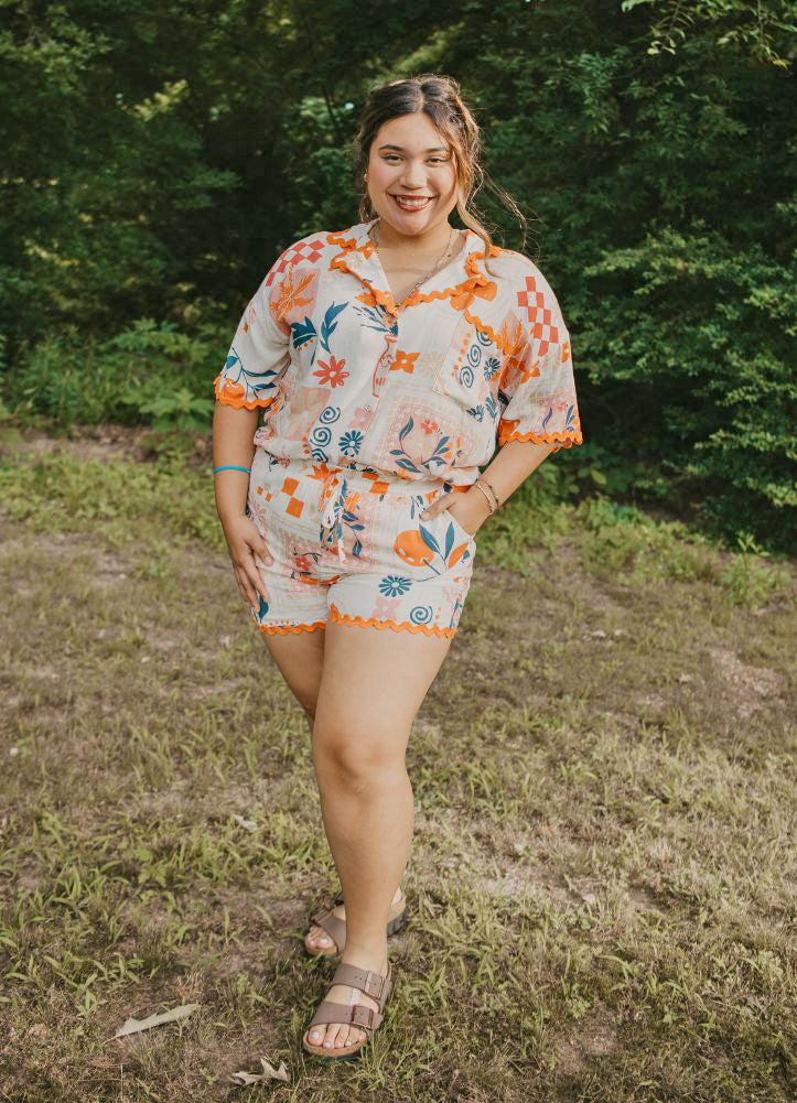 Add a touch of vintage charm with this breezy short-sleeve blouse featuring a playful mix of florals and swirls. Accented with rickrack trim and a relaxed fit, it's perfect for lounging or adding a pop of personality to your daytime look.