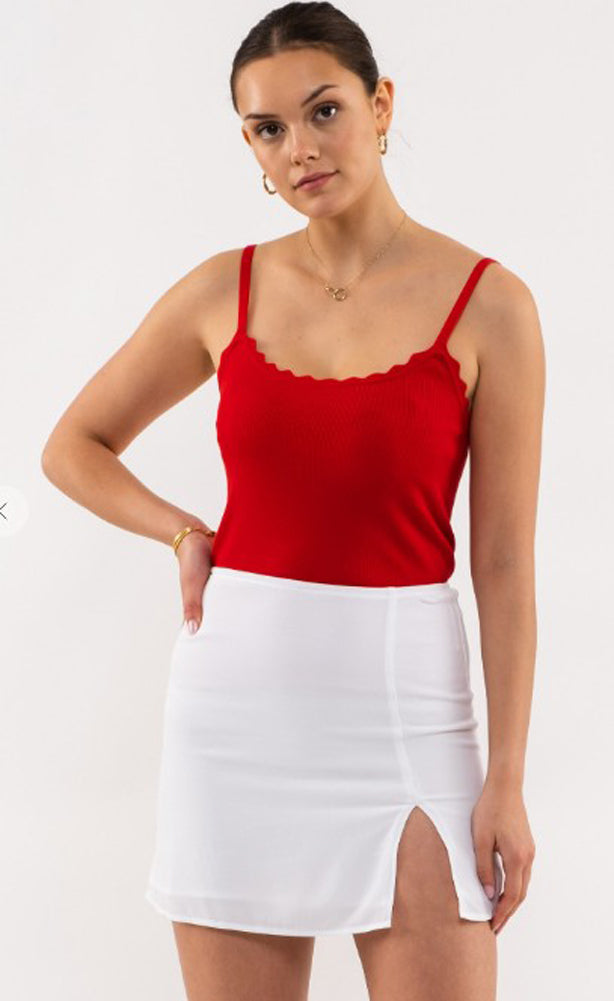 Turn up the heat with this bold red cami, featuring a flattering scalloped neckline and slim adjustable straps. Made from a soft, stretchy ribbed knit, it hugs in all the right places and layers effortlessly under jackets or stands out beautifully on its own. A must-have for your warm-weather wardrobe.