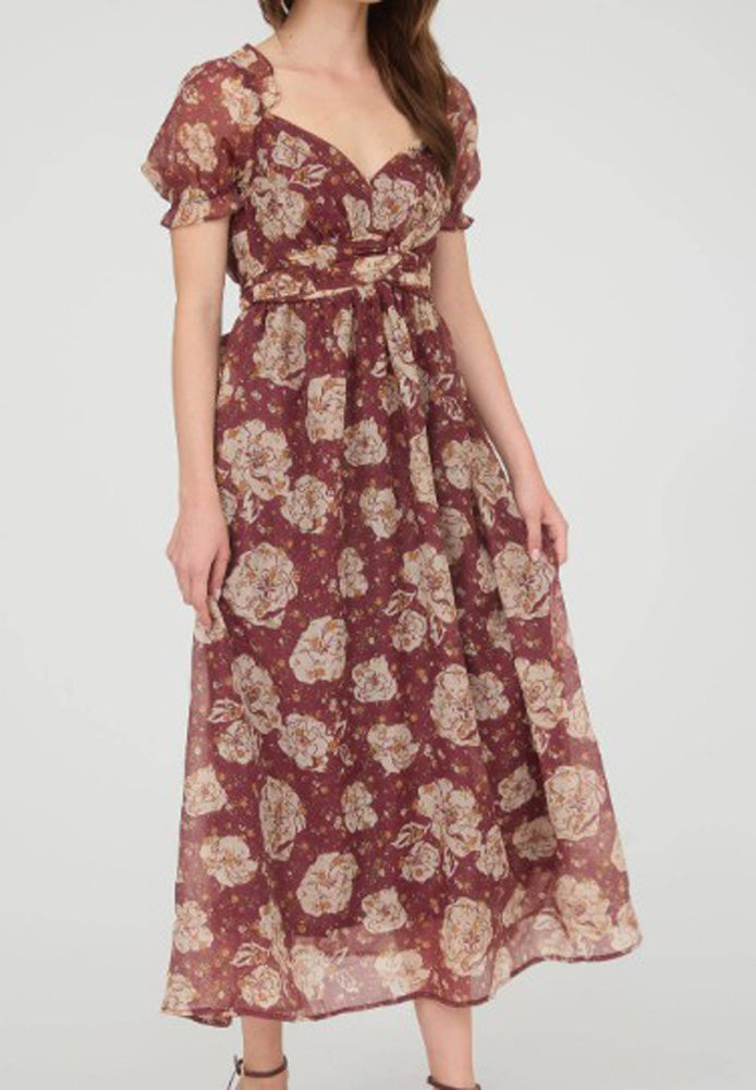 Embrace timeless romance with this beautifully crafted floral midi dress, featuring a rich burgundy hue accented by a soft, vintage-inspired floral print. Designed with a flattering sweetheart neckline, delicate puff sleeves, and a gently cinched waist, this lightweight, flowy dress creates an elegant silhouette that's perfect for weddings, date nights, seasonal events, or any occasion where effortless femininity and comfort come together.