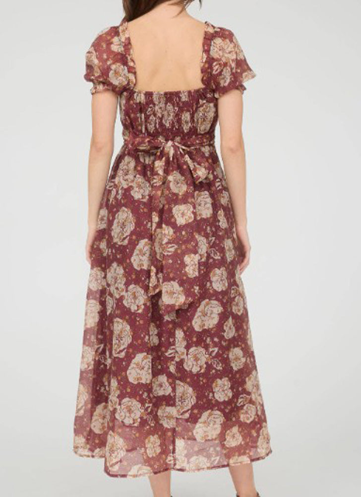 Floral Sweetheart Neck Back Tie Midi Dress in Burgundy Multi by Blu Pepper