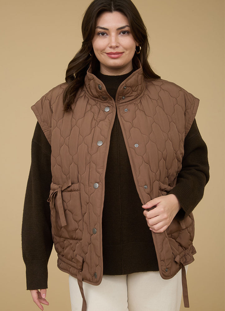 Plus Tie Detail Snap Button Down Quilted Vest in Brown by Blu Pepper