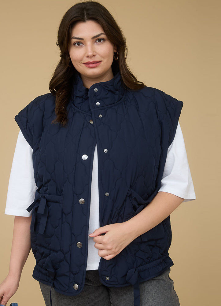 Plus Tie Detail Snap Button Down Quilted Vest in Navy by Blu Pepper