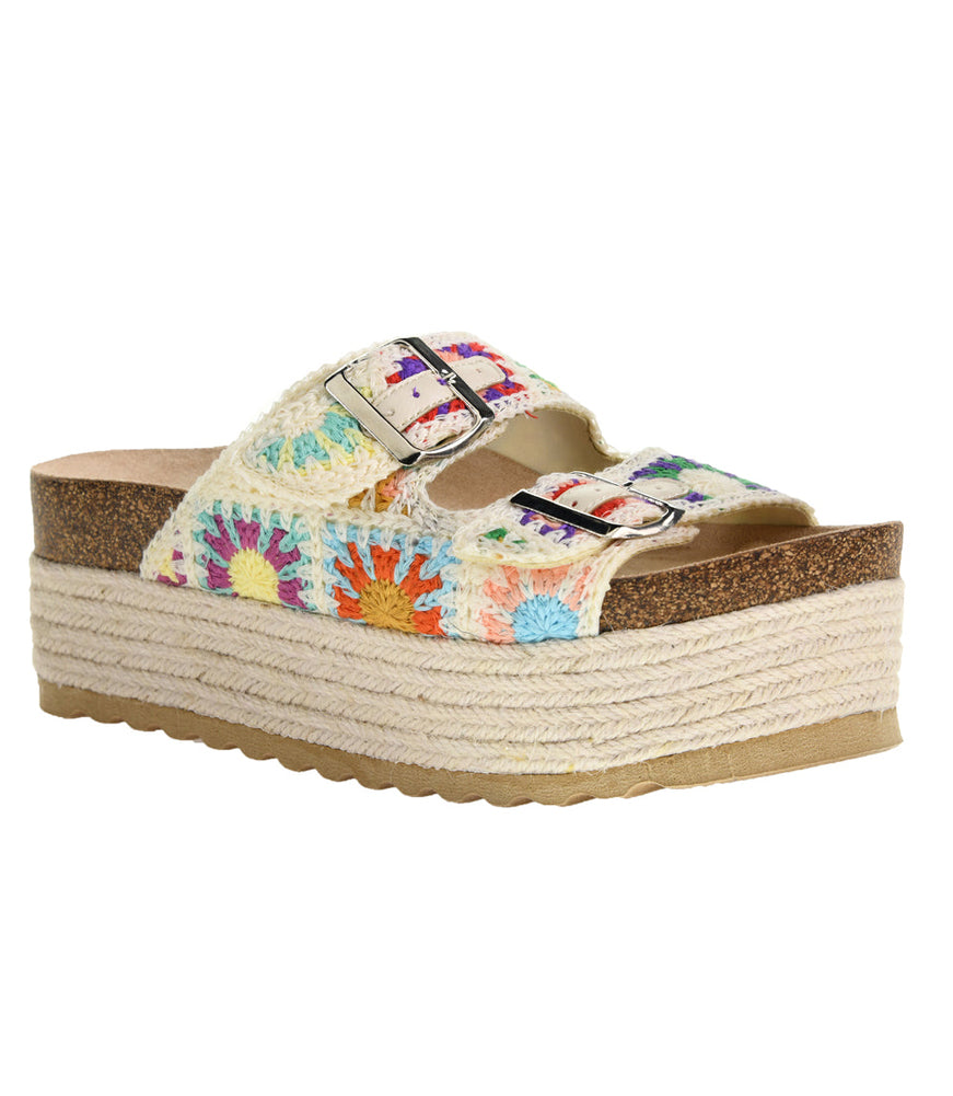 Step into boho-chic charm with these vibrant platform sandals—featuring a hand-crocheted floral upper, adjustable buckle straps, and a rope-wrapped espadrille sole for a playful yet earthy summer statement.