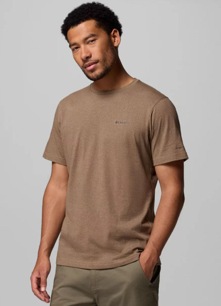 Keep it simple and functional with the Columbia Men's Short-Sleeve T-Shirt in a neutral brown shade, crafted from soft, breathable fabric for everyday comfort, outdoor activities, and effortless casual style.