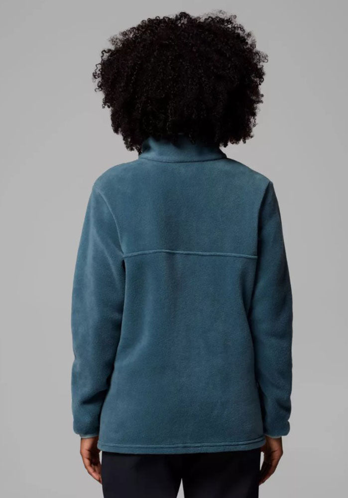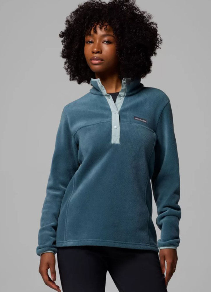Embrace cozy comfort with the Columbia Women's Snap-Front Fleece Pullover in teal, featuring soft fabric, a relaxed fit, and versatile style perfect for layering on outdoor adventures or casual everyday wear.