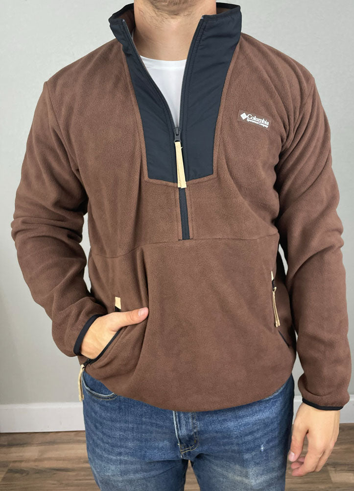 Stay warm and adventure-ready with this Columbia pullover, featuring a soft brown fleece body, a contrasting black quarter-zip panel, and roomy zippered pockets perfect for both everyday comfort and outdoor style.
