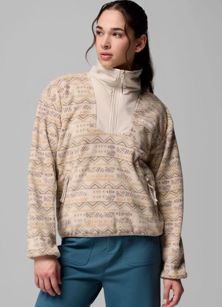 Cozy up in style with the Columbia Women's Printed Quarter-Zip Fleece Pullover, featuring a soft fabric, warm high collar, and chic geometric pattern that blends everyday comfort with outdoor-ready versatility.