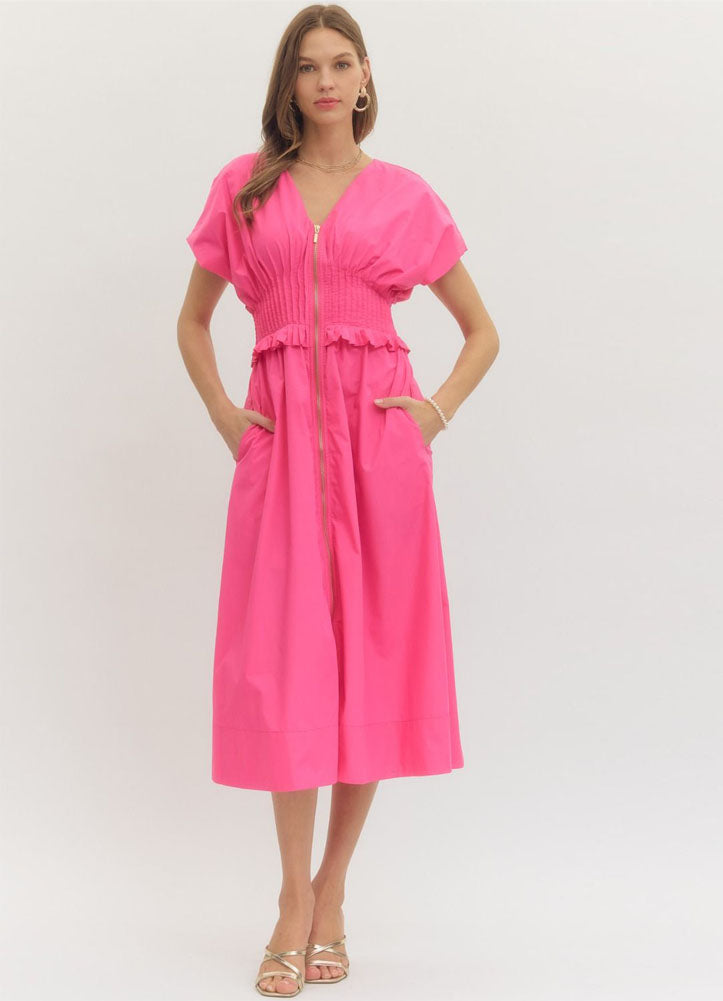 Bright, bold, and effortlessly feminine, this hot pink midi dress is designed to turn heads. Featuring a flattering V-neckline with a functional front zipper, it offers adjustable styling from polished to playful. The smocked waist cinches comfortably to define your shape, while a subtle ruffle detail adds a soft, flirty touch. Short flutter sleeves and a flowy skirt create an easy, breezy silhouette that moves beautifully with you. Thoughtful side pockets add everyday practicality without sacrificing style. Perfect for brunch dates, summer parties, or vacation days, this vibrant dress pairs seamlessly with heels or sandals for a look that's confident, chic, and full of personality.