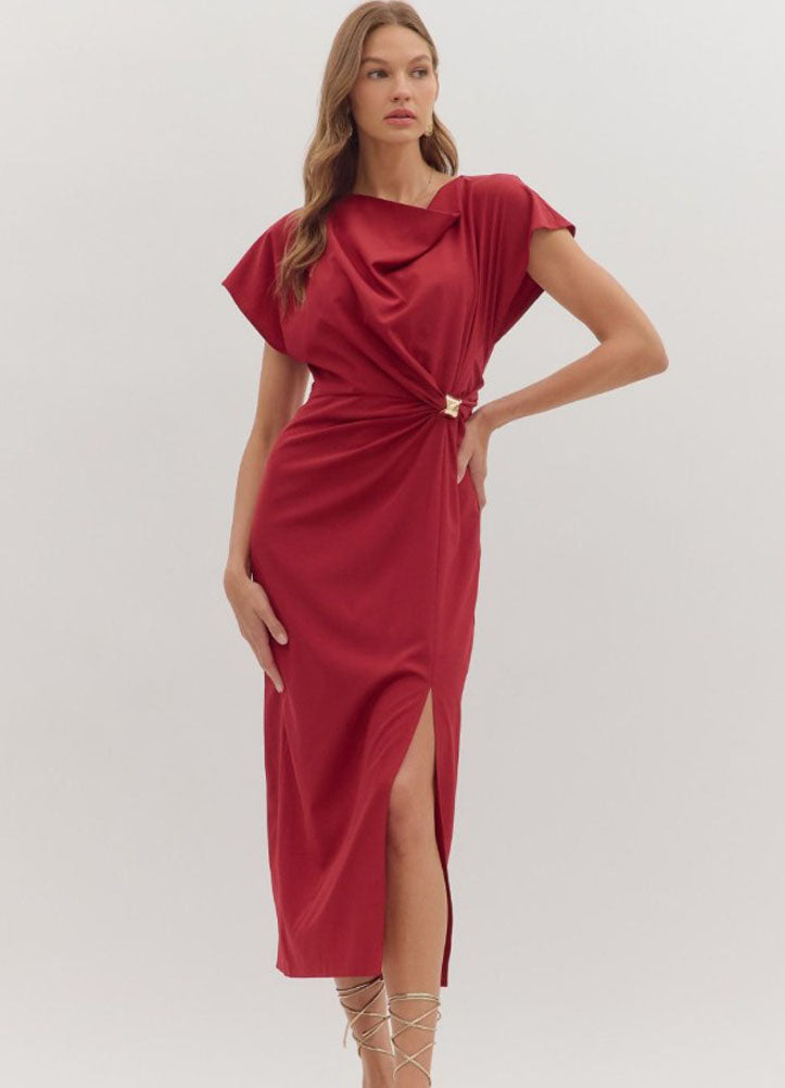 Turn heads in this stunning scarlet midi dress, designed with elegant draping, a chic gold accent at the waist, and a flattering side slit for the perfect touch of drama. Its soft, flowing silhouette creates effortless sophistication, making it an ideal choice for holiday parties, evening events, or any special occasion where you want to feel confident and glamorous.