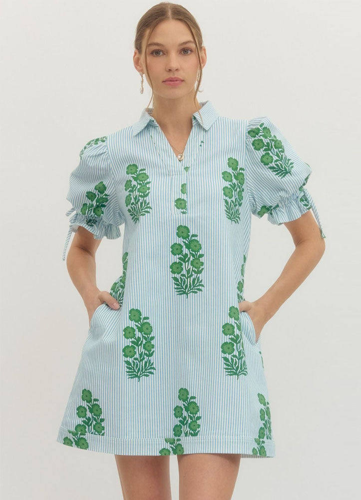 Striped Floral Print Puff Sleeve Mini Dress in Green by Entro