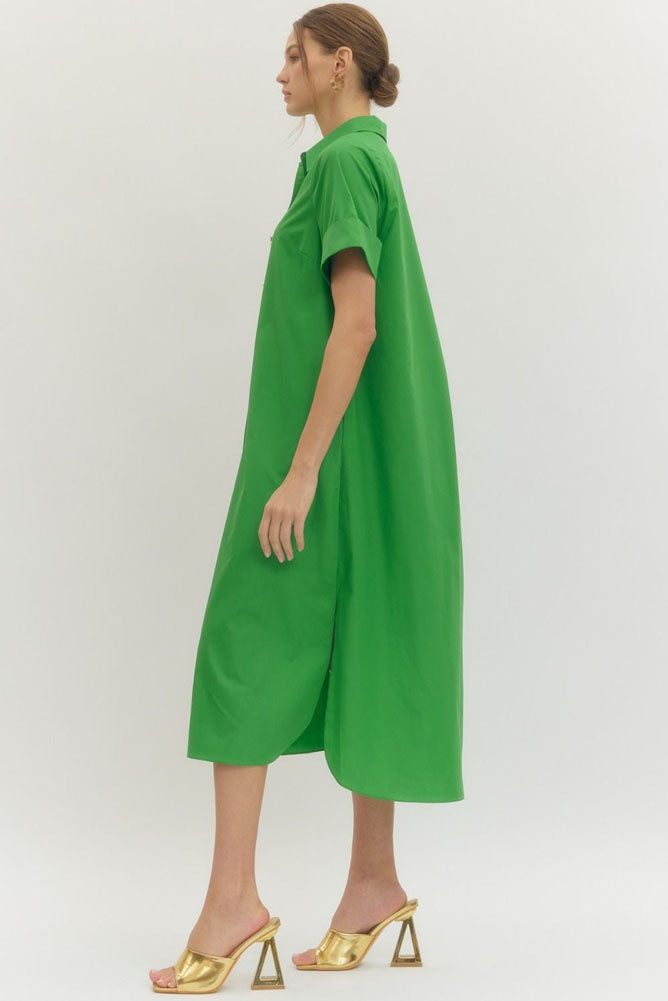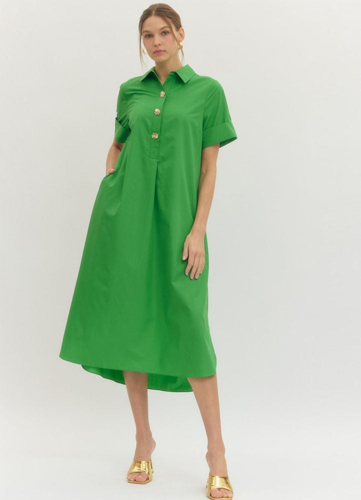Fresh, effortless, and endlessly wearable, this midi shirt dress brings a polished pop of color to your everyday wardrobe. Designed in a vibrant green hue, it features a classic collared neckline with a partial button front accented by decorative statement buttons for a refined touch. The relaxed A-line silhouette drapes beautifully, offering comfort without sacrificing style, while short cuffed sleeves keep the look crisp and modern. Thoughtful side pockets add everyday practicality, and the midi length creates an easy, flattering finish. Perfect for workdays, brunch dates, or casual events, this dress pairs seamlessly with sandals, wedges, or heels for versatile styling from day to night.