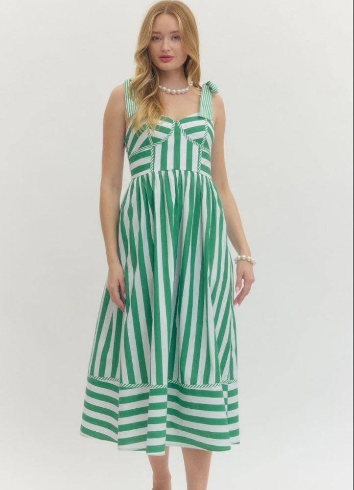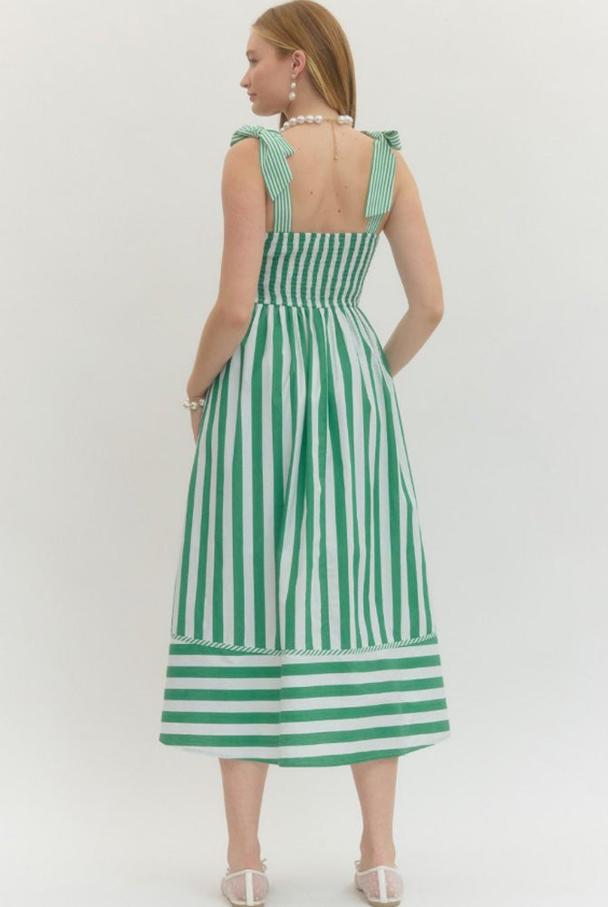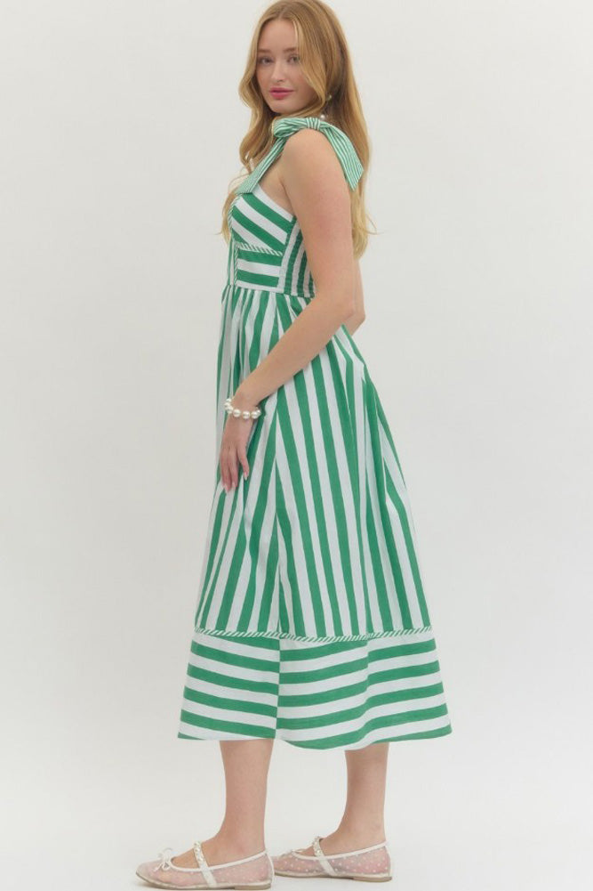 Striped Tie Sleeve Midi Dress in Green by Entro