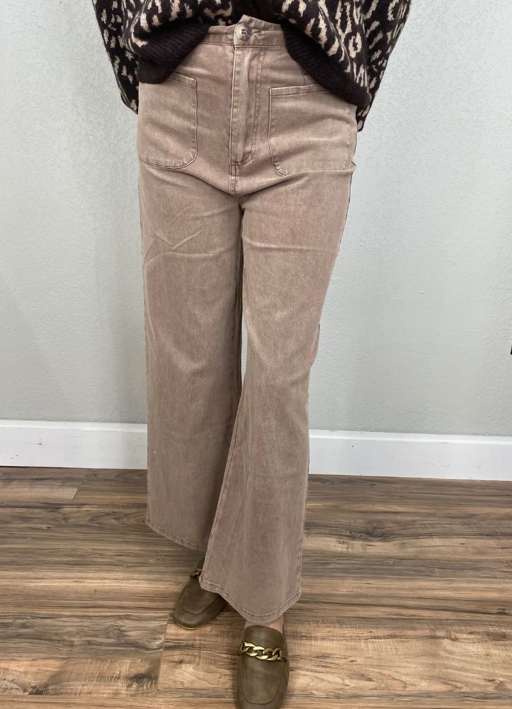 Step into effortless style with these taupe wide-leg pants, designed with a flattering high-rise fit and statement front patch pockets. Made from a soft, slightly textured fabric, they offer both comfort and sophistication for everyday wear. Perfect to pair with cozy sweaters or sleek blouses, these versatile pants bring a modern twist to classic wardrobe staples.