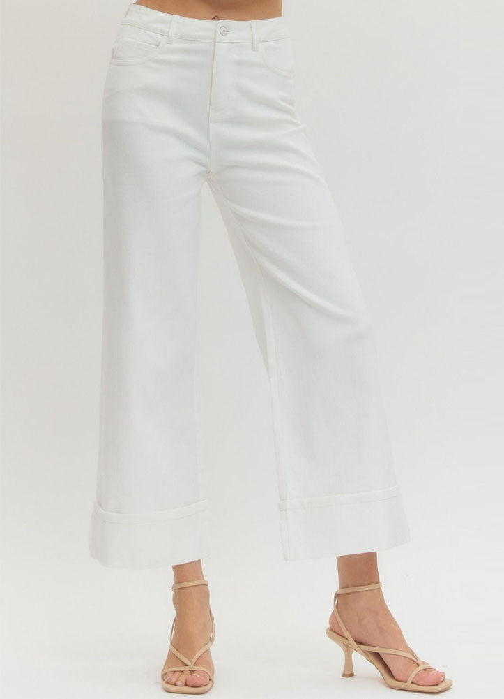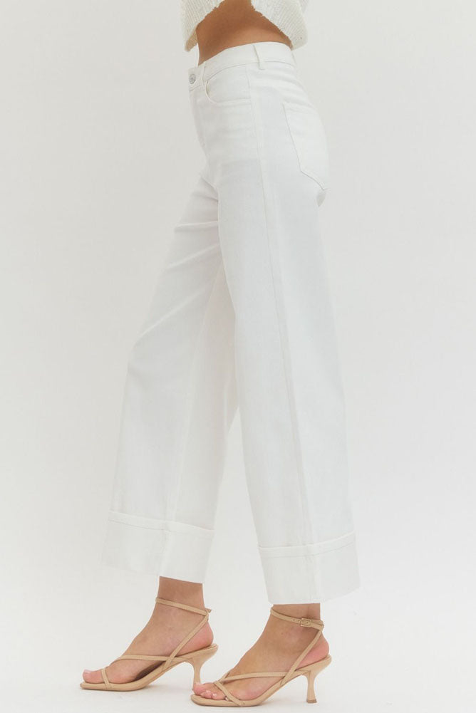 These crisp white wide-leg cuffed pants deliver a fresh, polished look with effortless versatility. Designed with a flattering high-rise waist, they smooth and elongate the silhouette while offering a relaxed fit through the leg for all-day comfort. The structured wide-leg shape is finished with a statement cuffed hem, giving them a clean, modern edge that elevates any outfit. Crafted from a smooth, structured fabric, they hold their shape beautifully while remaining easy to wear. Complete with functional pockets, a button closure, and belt loops, these pants are as practical as they are stylish. The bright white hue pairs perfectly with everything from bold prints to soft neutrals, making them a warm-weather staple you'll reach for again and again Ideal for the office, brunch, or a polished everyday look.