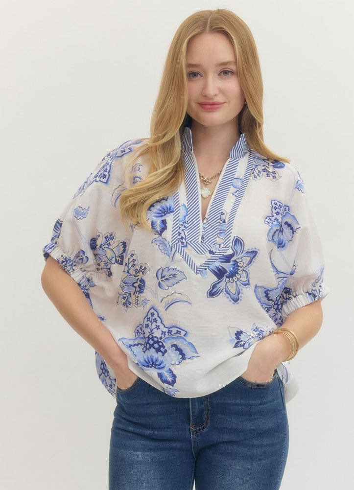 This blue floral blouse brings an effortless, feminine touch to everyday style. Crafted from a lightweight, airy fabric, it features a soft white base accented with delicate blue floral motifs for a fresh, timeless look. The split V-neckline is finished with striped trim for a subtle contrast, while gently gathered short sleeves add volume and a flattering drape. Relaxed through the body, this top pairs beautifully with denim for casual days or white pants for a crisp, polished outfit. Perfect for warm weather, brunch dates, or easy work-to-weekend wear.
