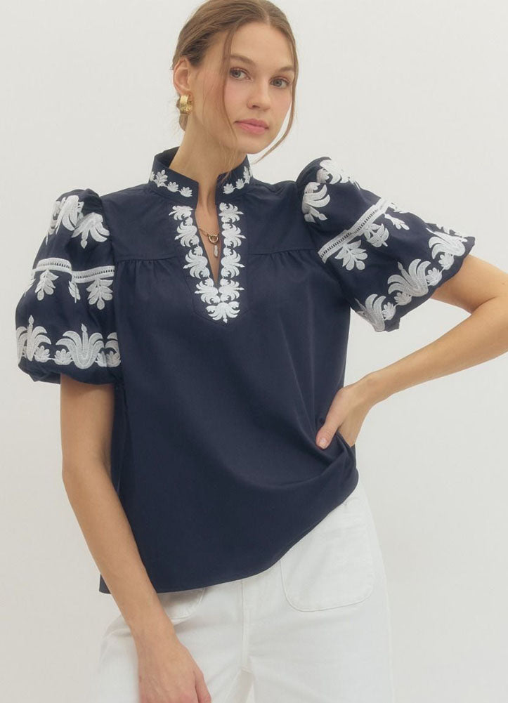 This navy embroidered blouse blends timeless elegance with a touch of modern drama. Crafted from a smooth, lightweight fabric, it features a rich navy base highlighted by intricate white embroidery along the split neckline and voluminous puff sleeves. The short sleeves are finished with delicate embroidered bands and subtle ladder trim, adding texture and visual interest. A relaxed, easy fit through the body makes it both flattering and comfortable, while the structured neckline gives it a polished feel. Perfect with white denim, tailored pants, or skirts, this blouse transitions effortlessly from daytime outings to elevated casual occasions.