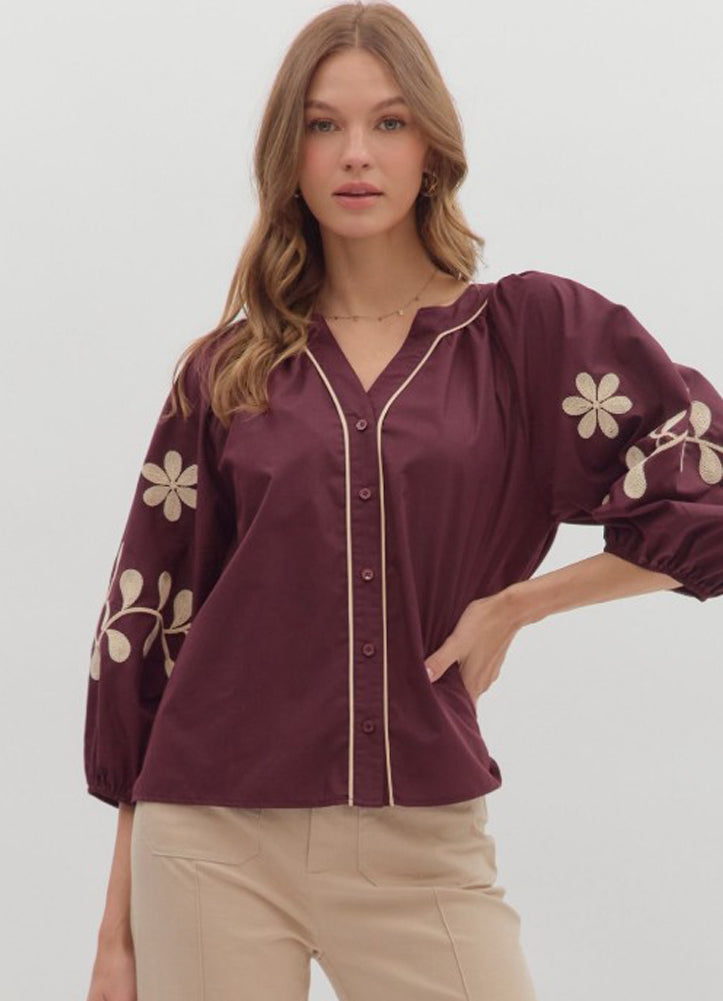Effortlessly elegant, this merlot blouse features button-down detailing, embroidered sleeves, and contrast piping for a chic, timeless look.