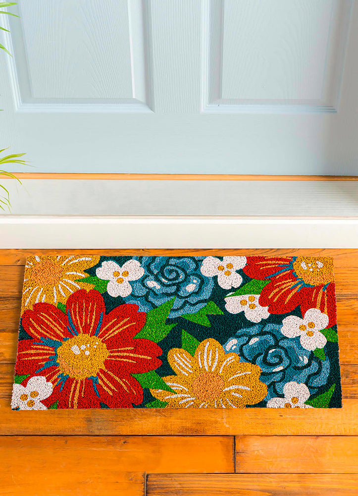 This is the perfect spring mat to add in front of your front door! This has red, yellow, blue, and white colored flowers on the mat. This brings a bright burst of color to your doorstep.