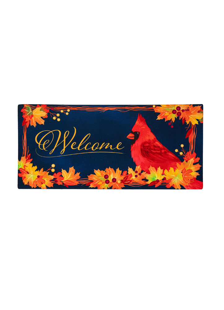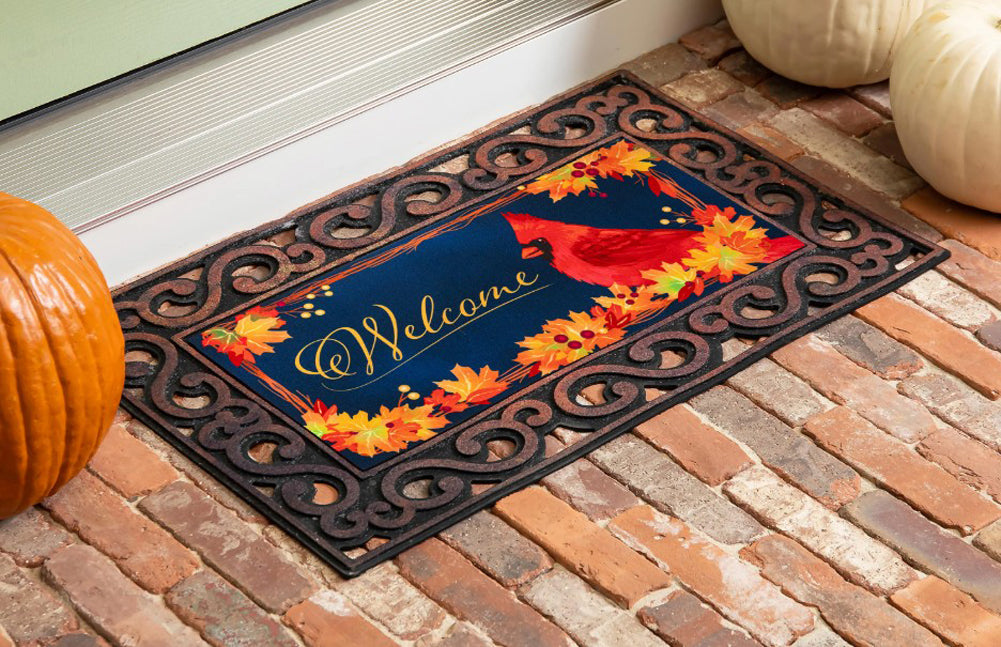 This decorative doormat features a bright red cardinal surrounded by vibrant autumn leaves and berries on a deep navy background, with the word “Welcome” elegantly scripted in gold. Perfect for adding a warm seasonal touch to any entryway.