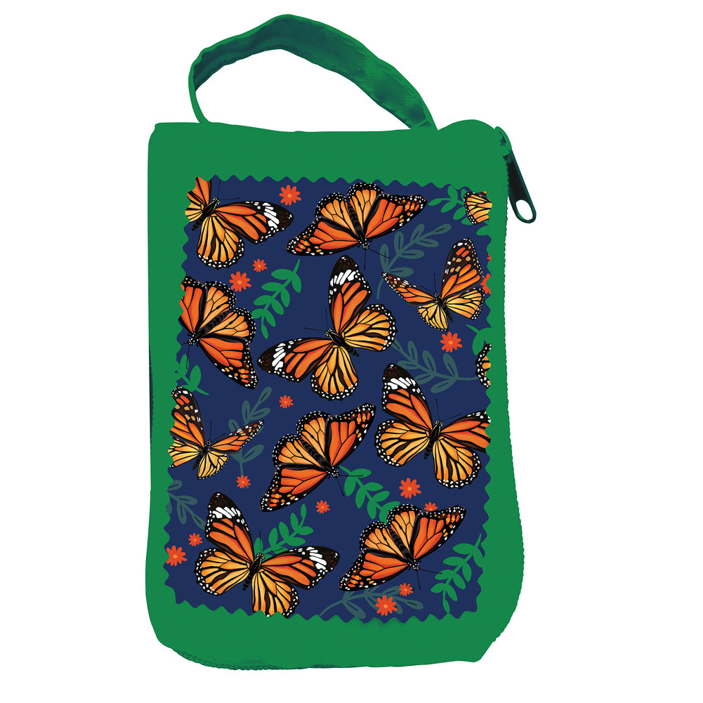 Brighten your day with every carry ?? — this vibrant tote features a fluttering monarch butterfly print with lively florals on a navy background and bold green handles.