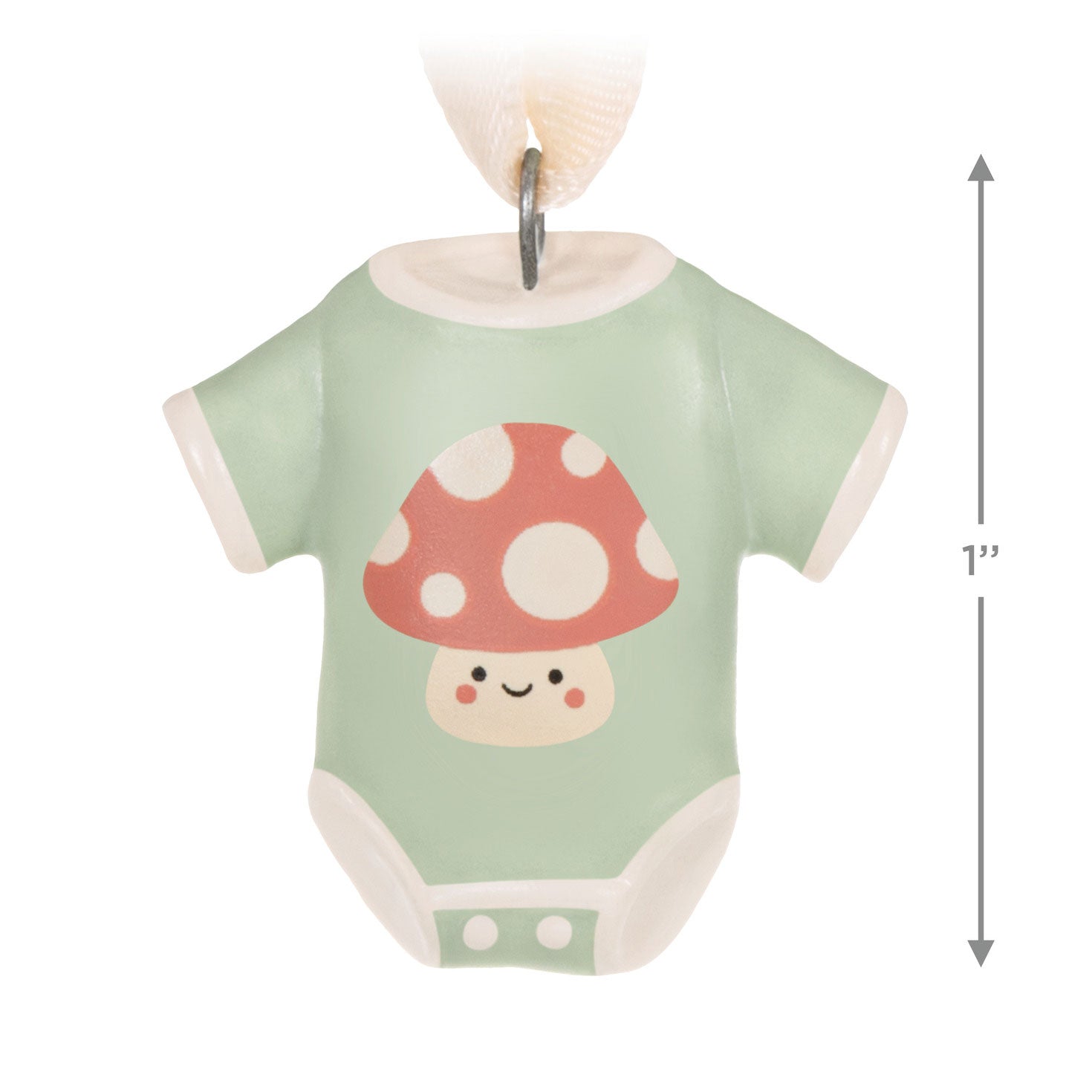 Celebrating the arrival of a sweet little someone? Display this adorable baby bodysuit! This porcelain miniature Christmas tree ornament featuring a light green bodysuit with a darling red mushroom design is perfect for baby's first Christmas. The petite piece also makes a cute attachment for baby shower gifts.