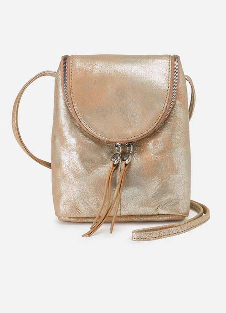 Compact yet eye-catching, this shimmery metallic crossbody is designed with a unique curved flap and double-zipper detailing. Featuring a structured silhouette, slim crossbody strap, and a convenient back slip pocket, it's the perfect hands-free companion for light travel or a night out.