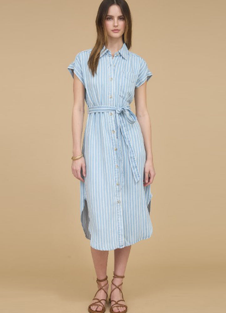 Stripe Chambray Collared Tie Belt Midi Dress by Blu Pepper