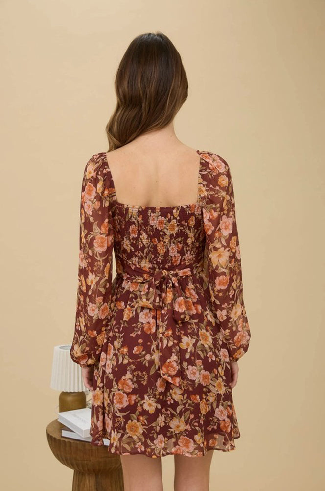 Floral Sweetheart LS Back Tie Mini Dress in Burgundy Multi by Blu Pepper